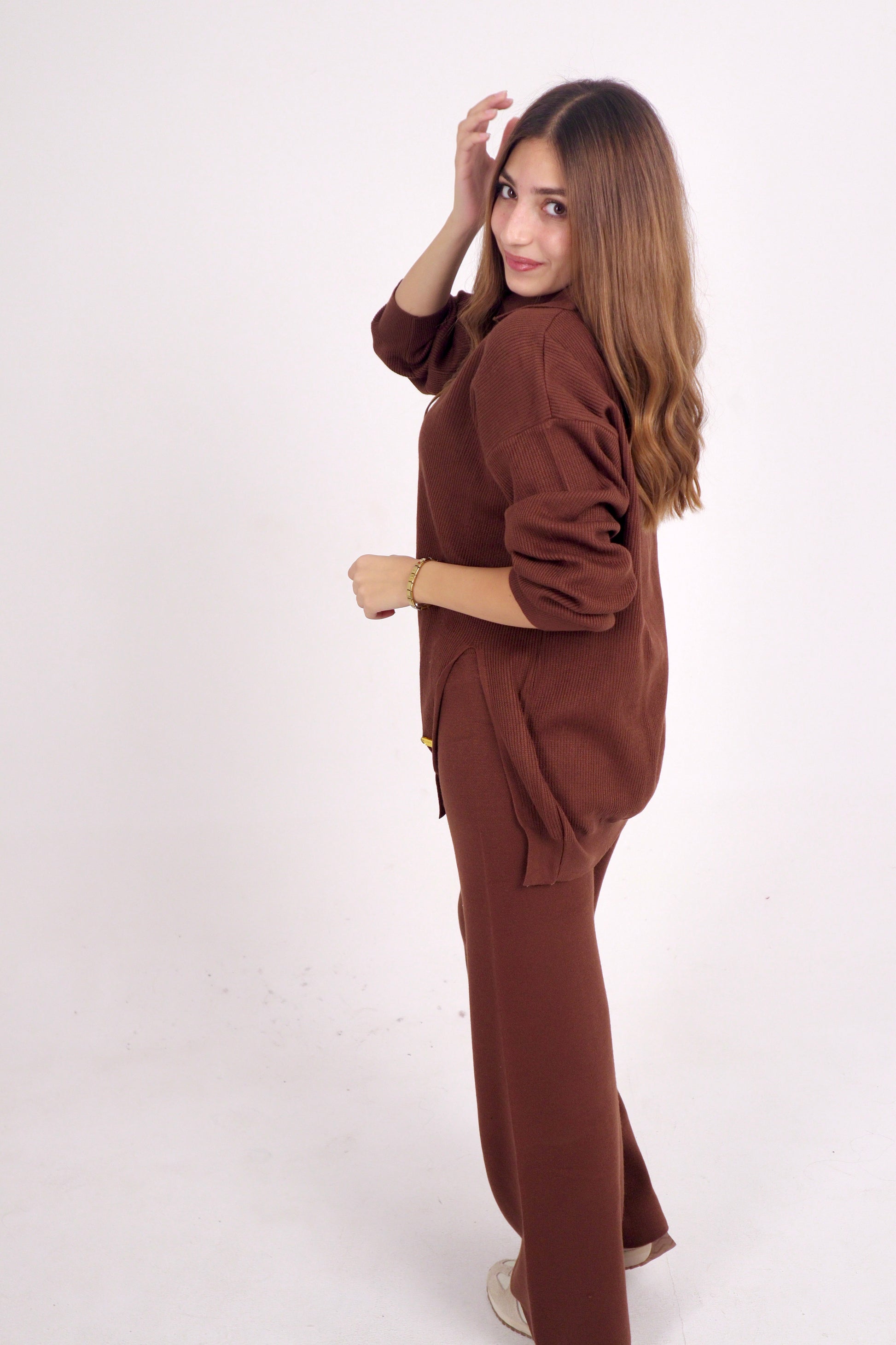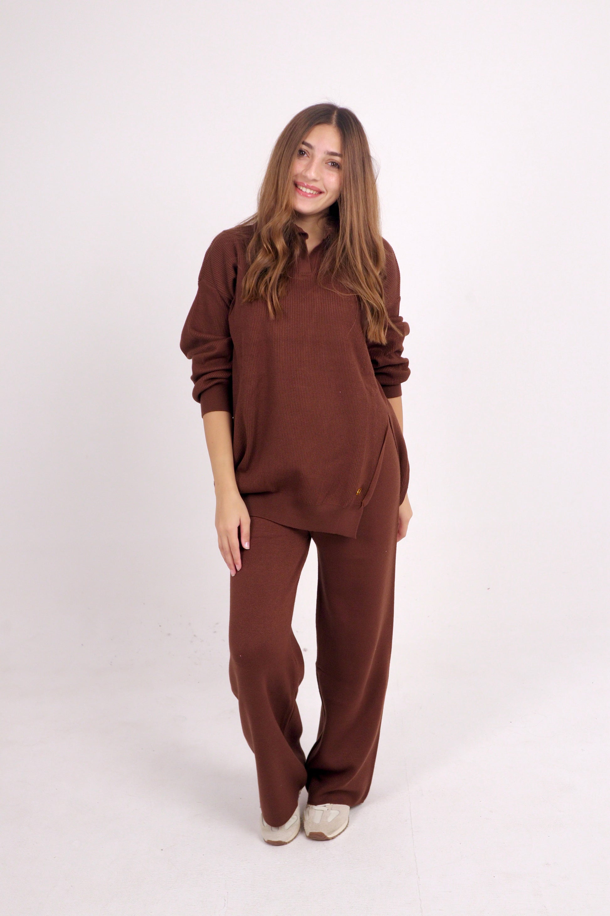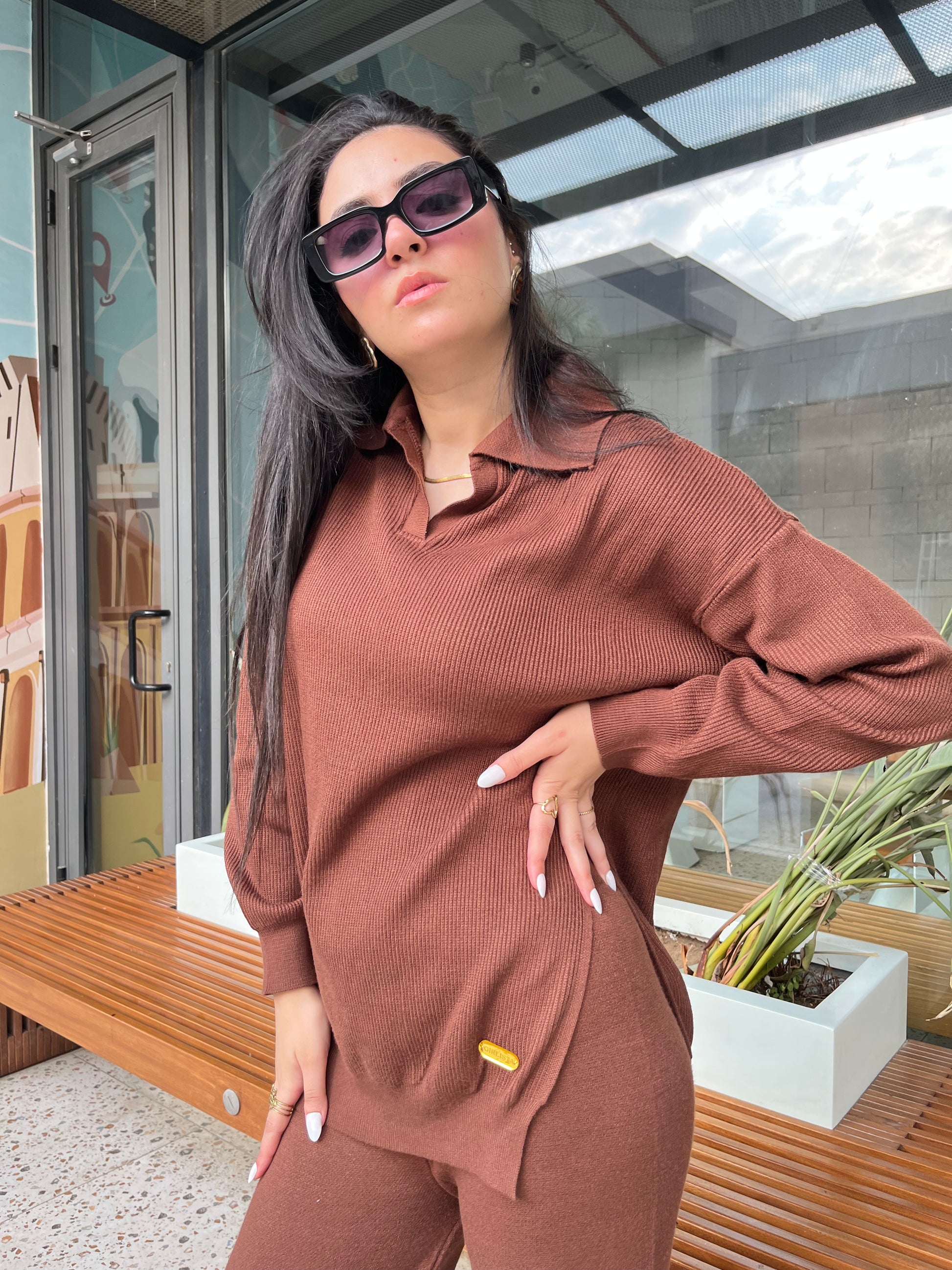 Espresso Set channels deep warmth and timeless charm with its rich brown hue (#642923). Crafted from ribbed knit fabric with a one-side slit blouse and collared neckline, it’s your go-to for effortless sophistication.