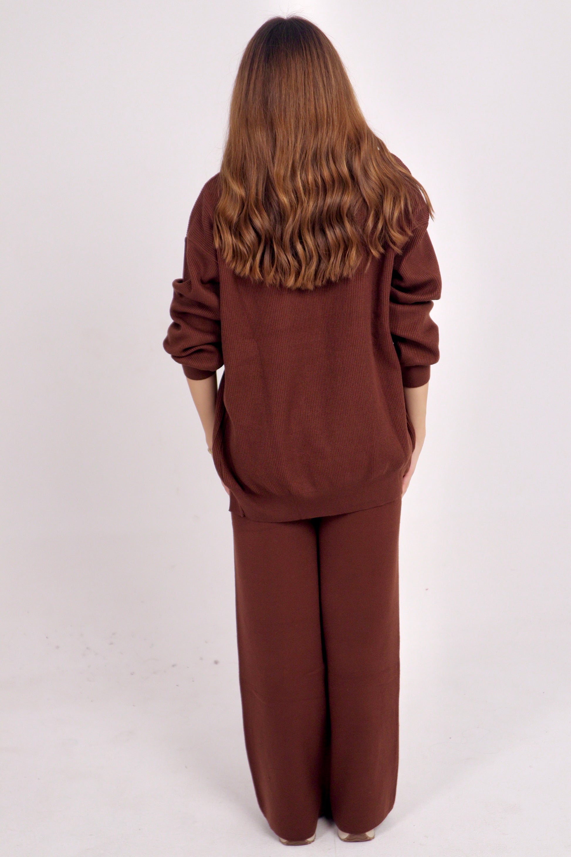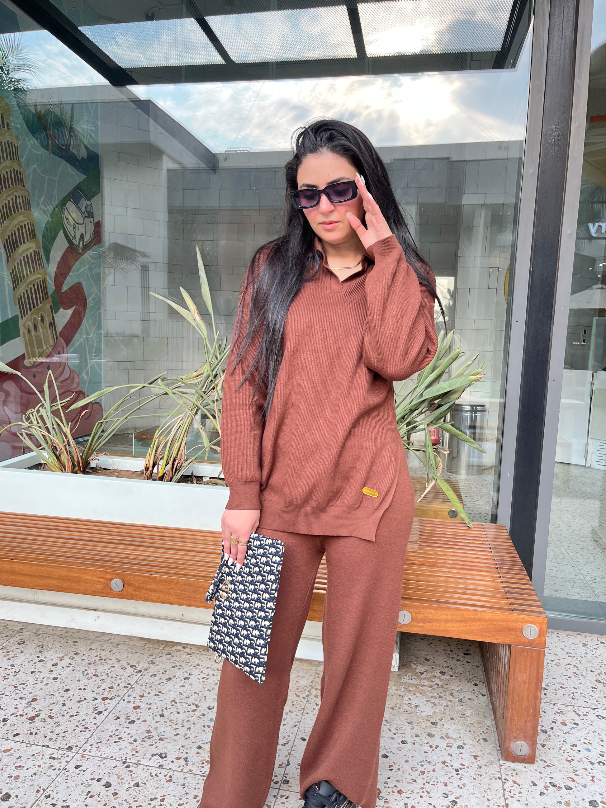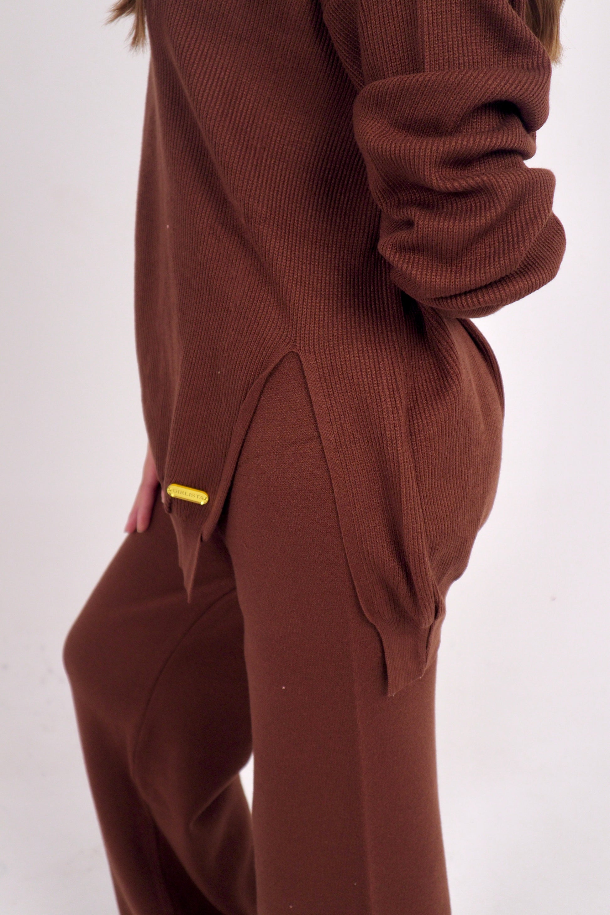 Espresso Set channels deep warmth and timeless charm with its rich brown hue (#642923). Crafted from ribbed knit fabric with a one-side slit blouse and collared neckline, it’s your go-to for effortless sophistication.