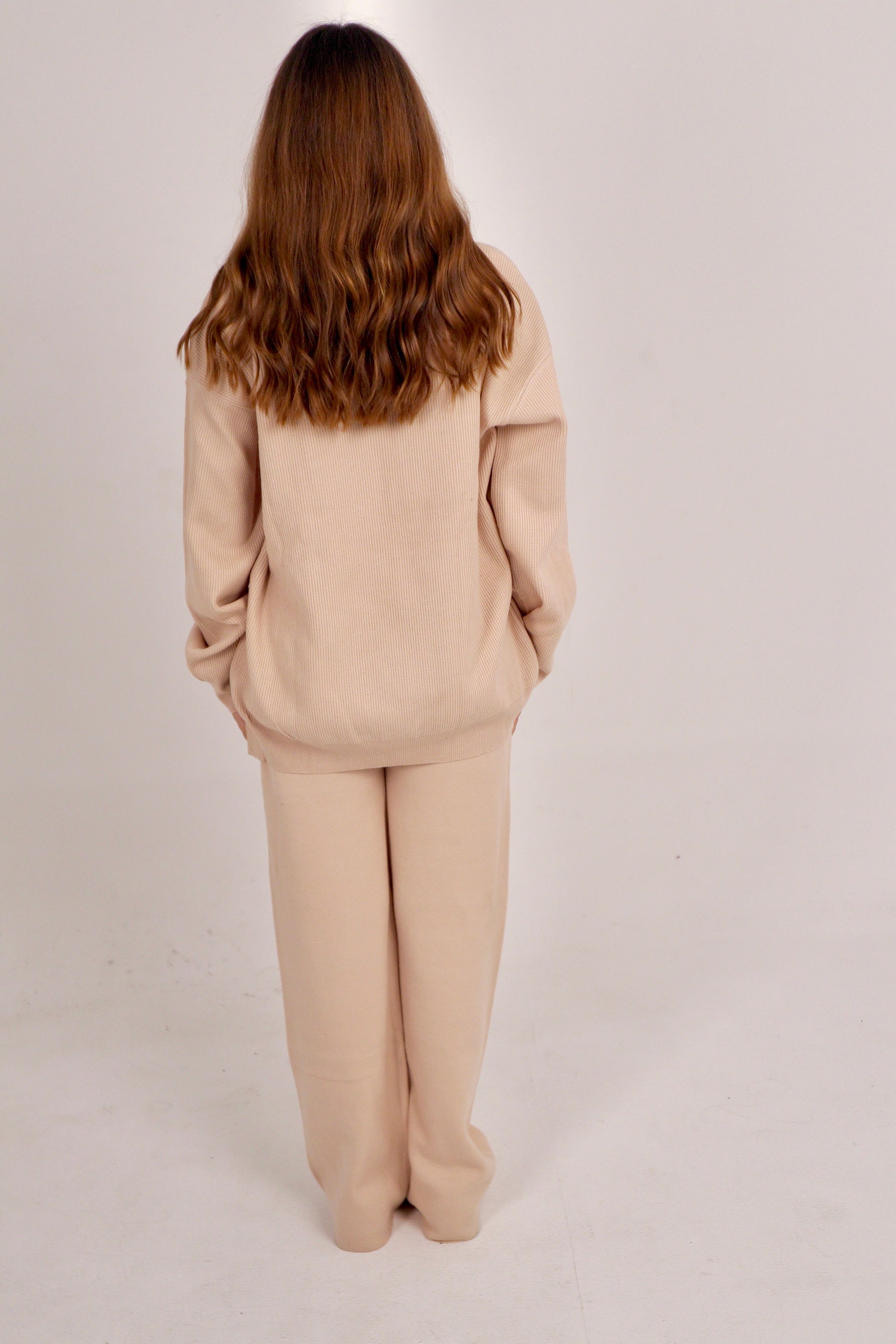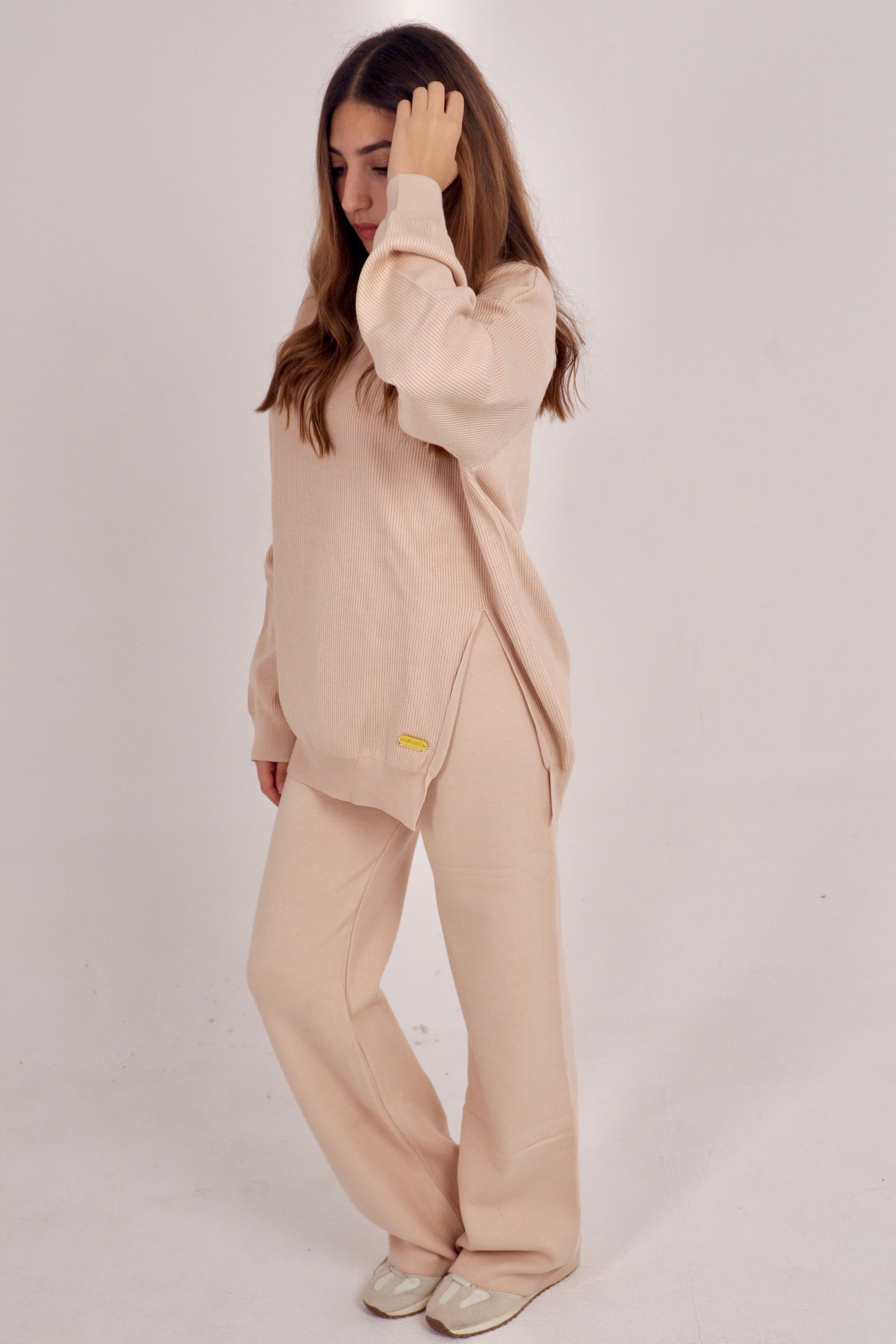 Latte Set captures calm sophistication with its creamy beige hue (#d5b9a8). Designed from soft ribbed knit fabric featuring a side-slit blouse and collared neckline, it blends everyday comfort with refined elegance — perfect for effortless, timeless style.