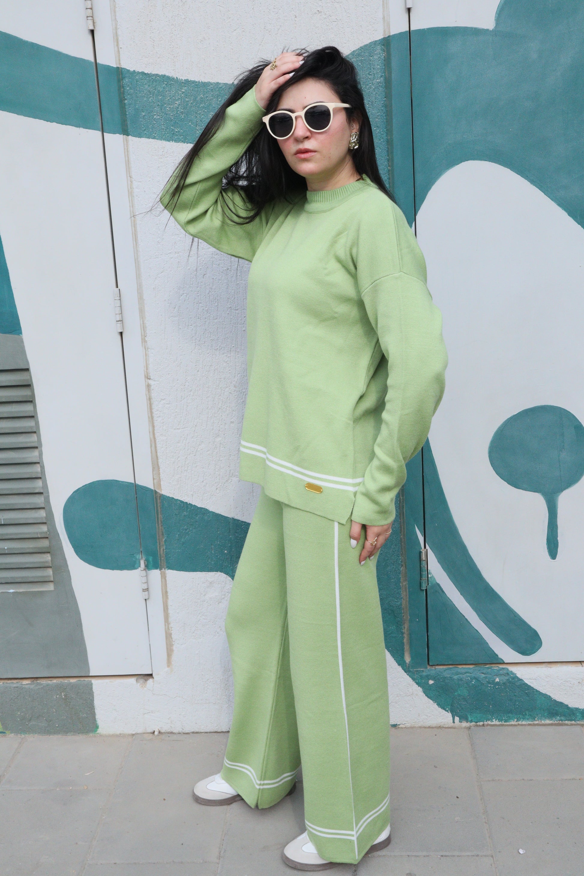 Pistachio Set captures fresh elegance with its soft green hue that radiates calm and confidence. Crafted from cozy knit fabric and detailed with white trim, it’s the perfect blend of comfort and modern freshness — ideal for bright winter mornings or casual chic days out.