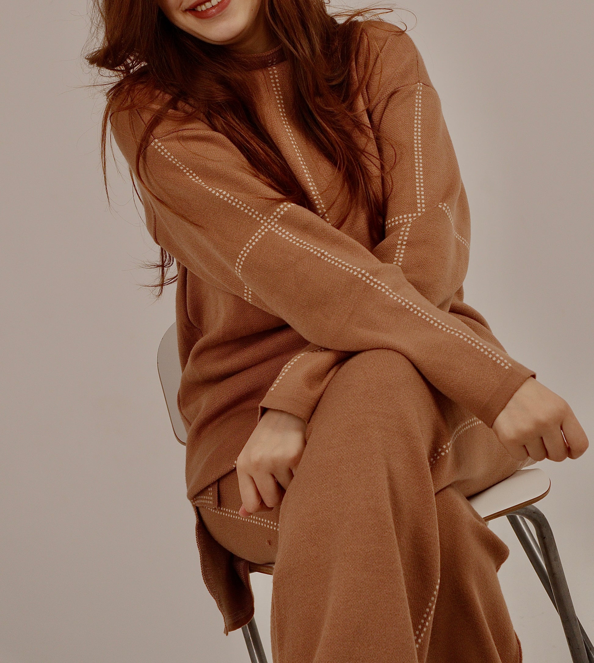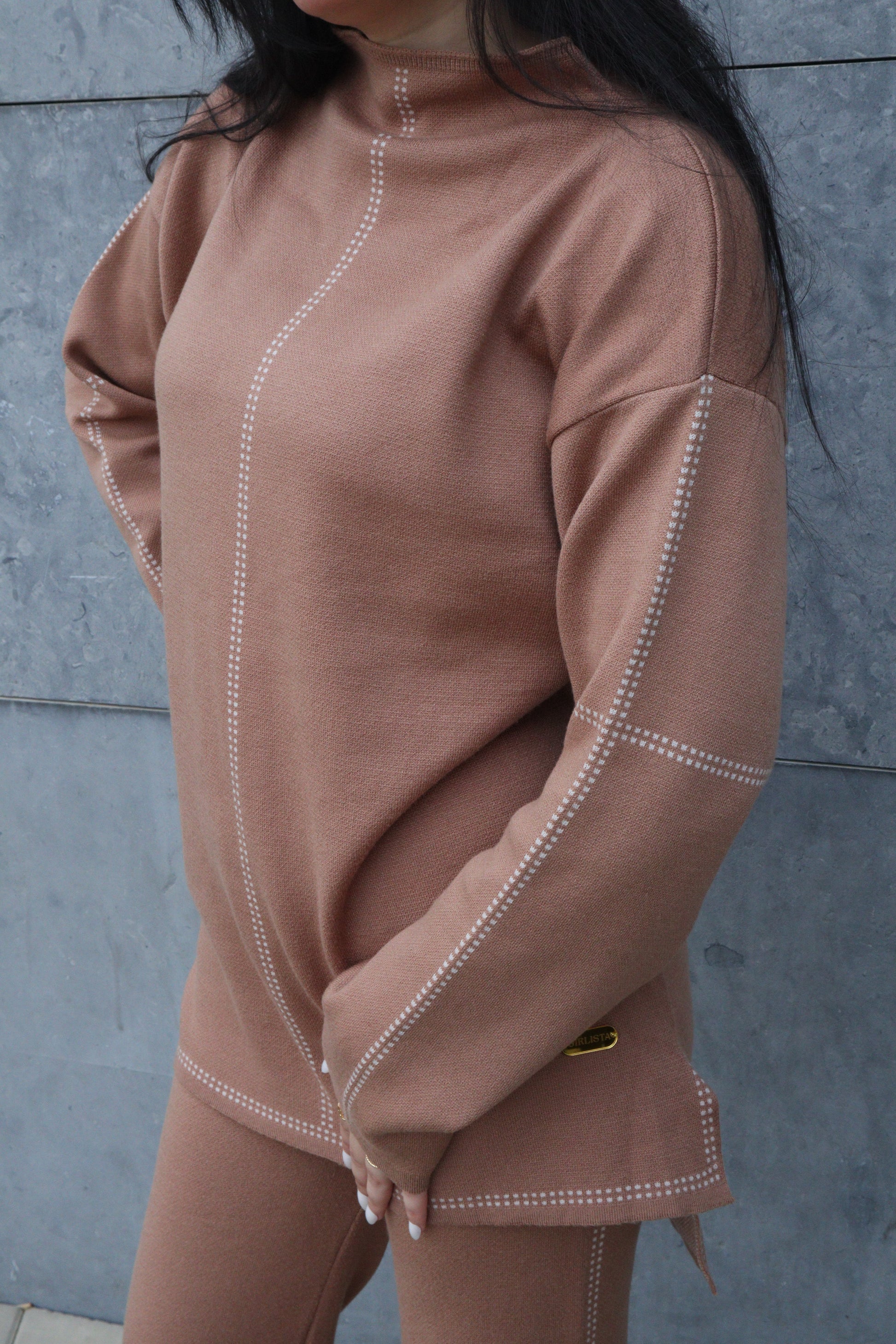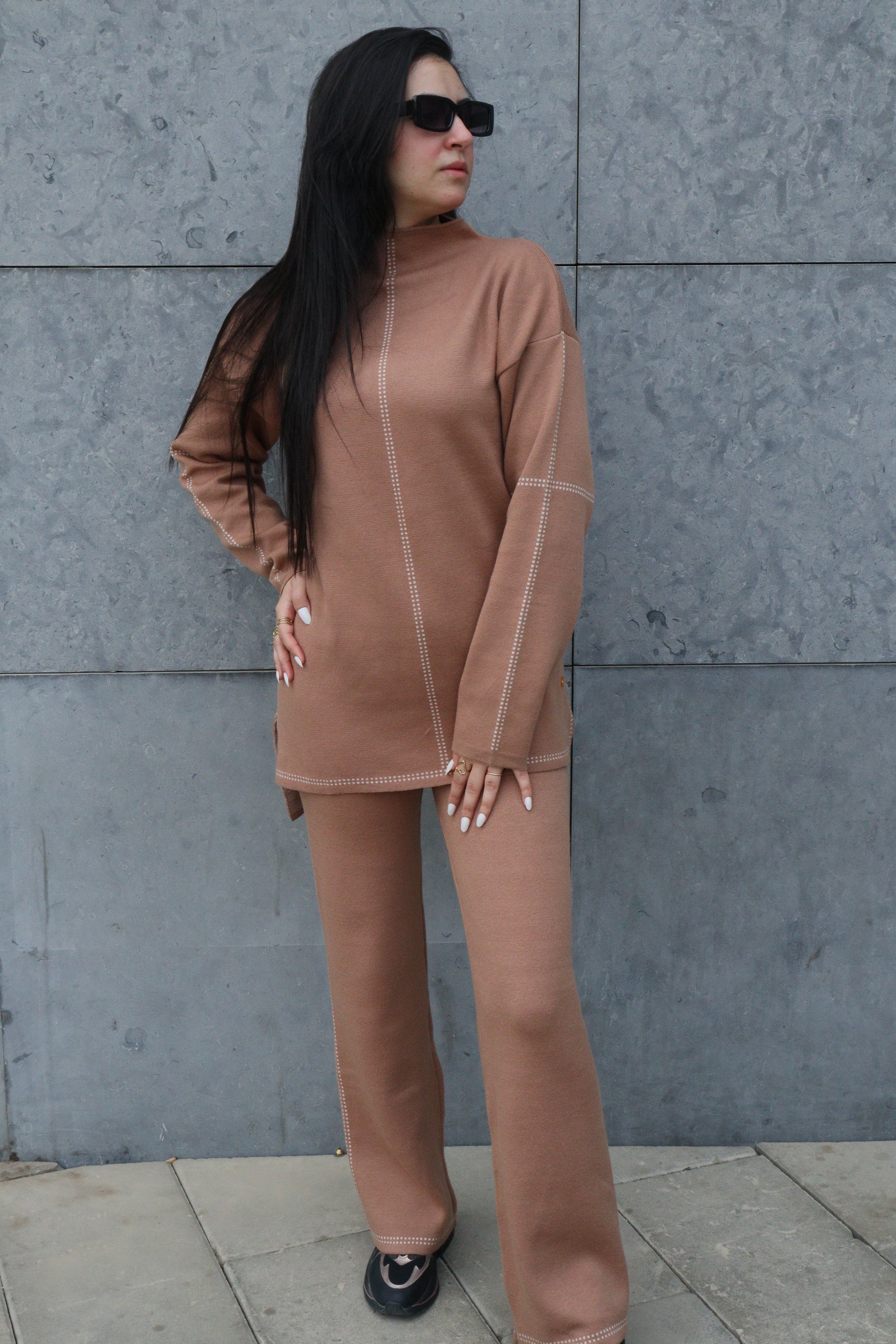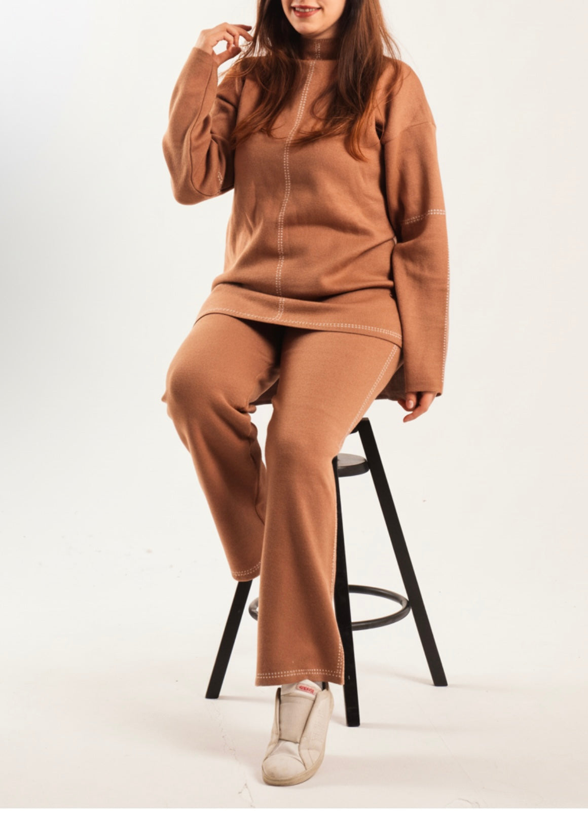 The Trace Set in Havan captures the warmth of earthy tones with a refined, modern touch. Its soft ribbed knit and subtle sheen bring effortless chic to your everyday look — perfect for cozy days or elevated casual outings.