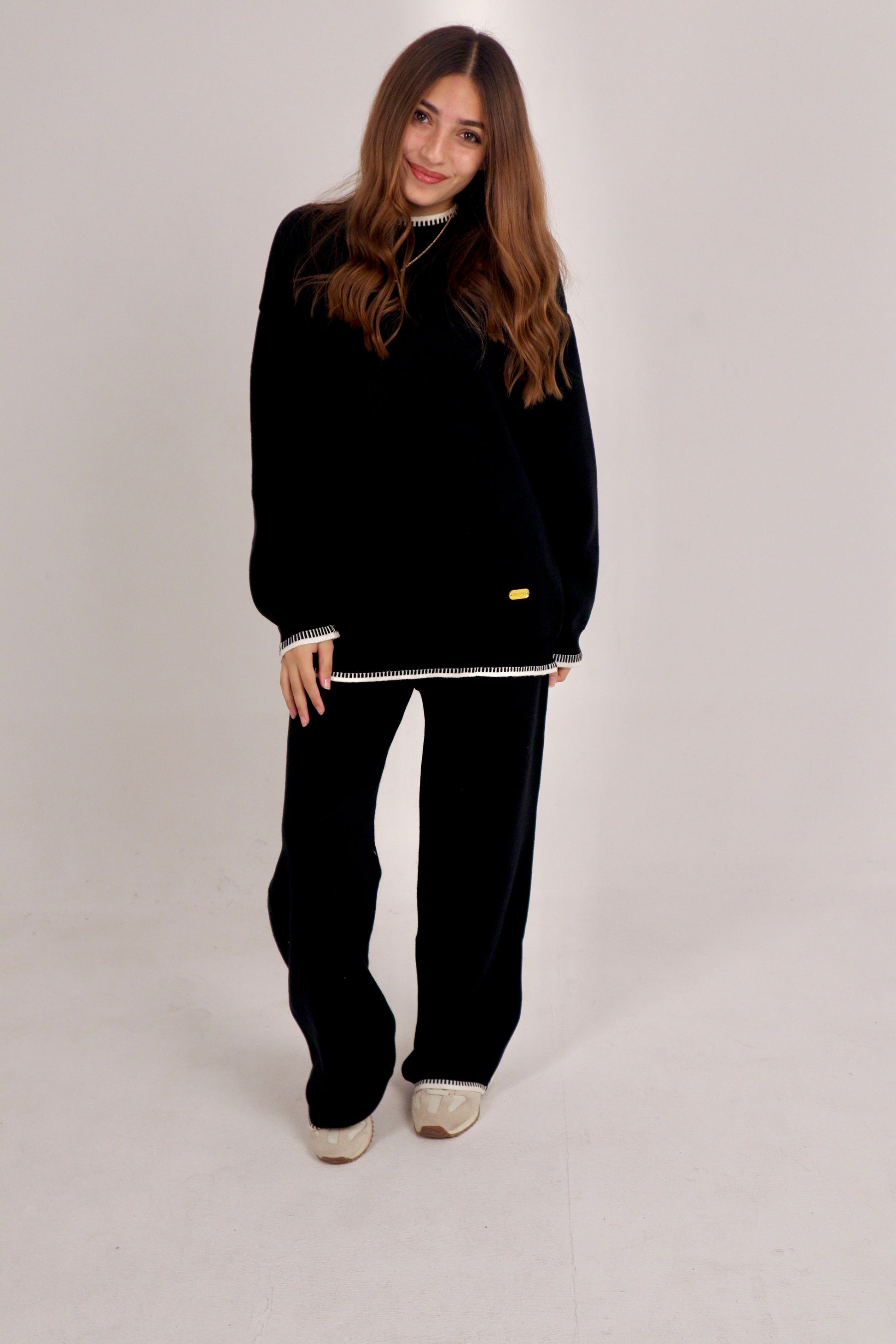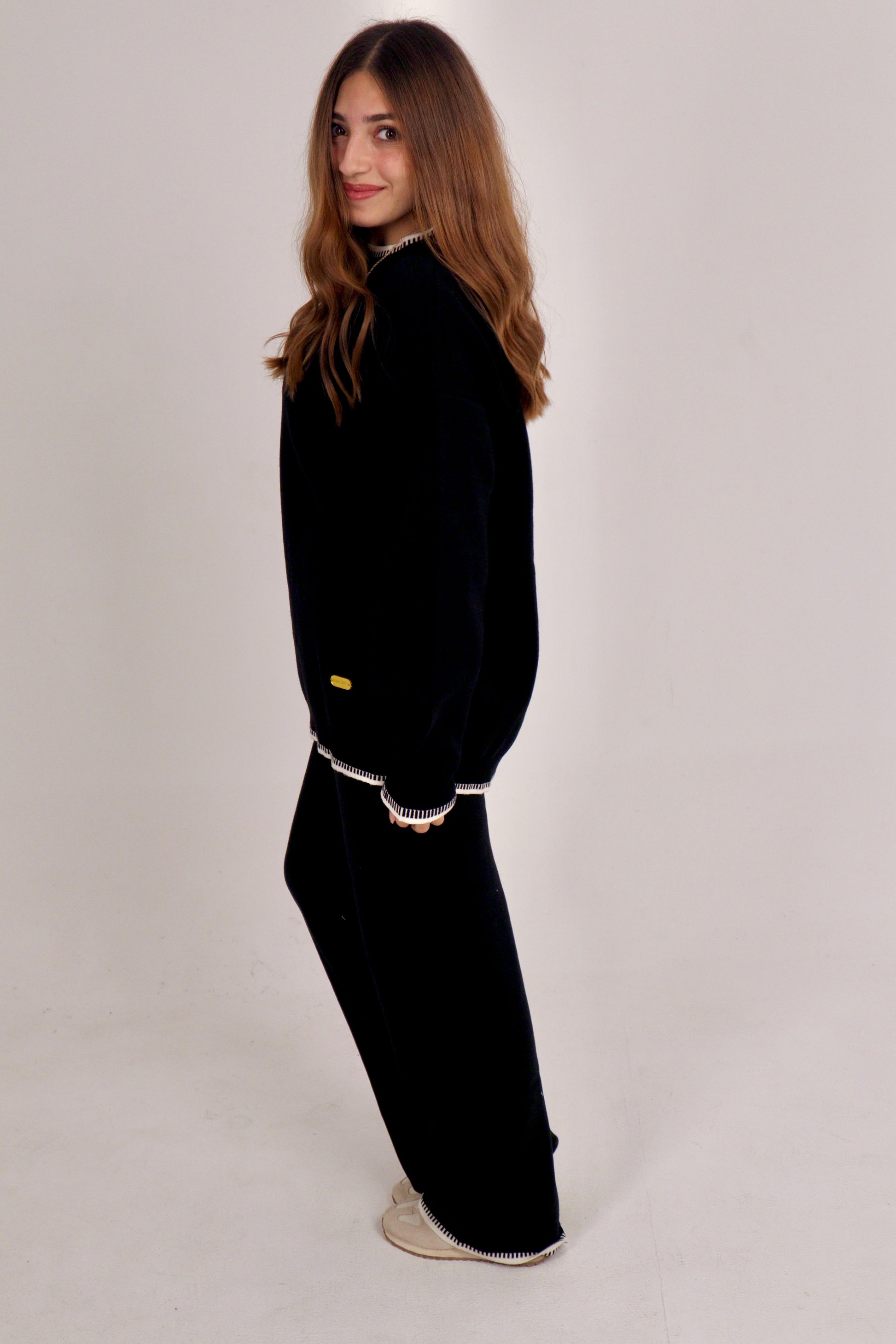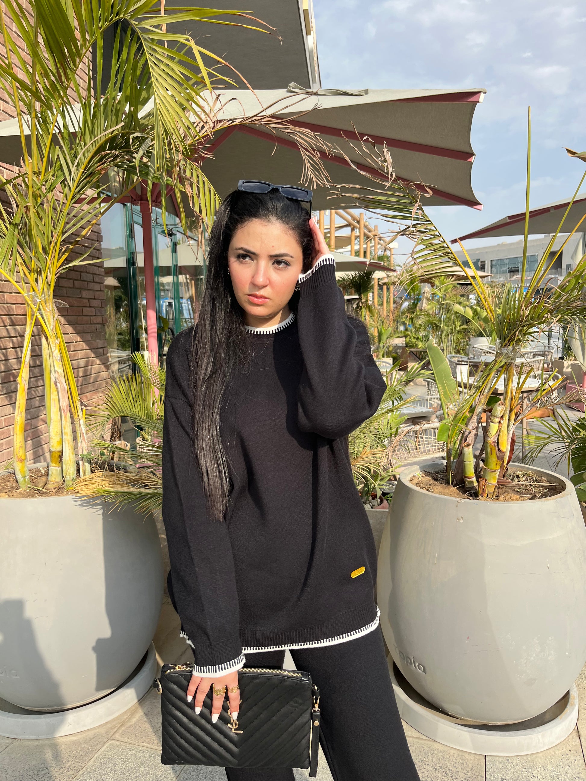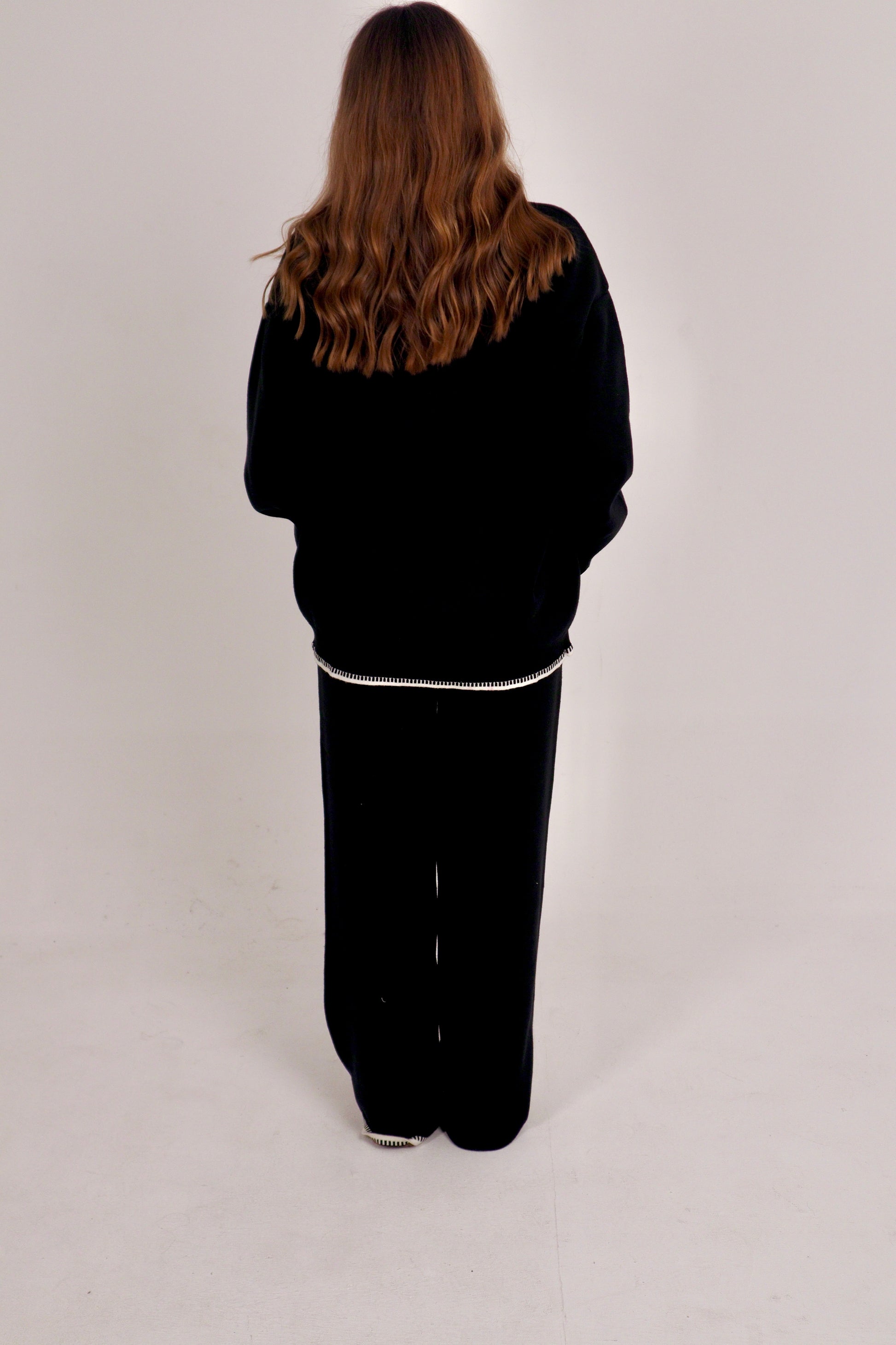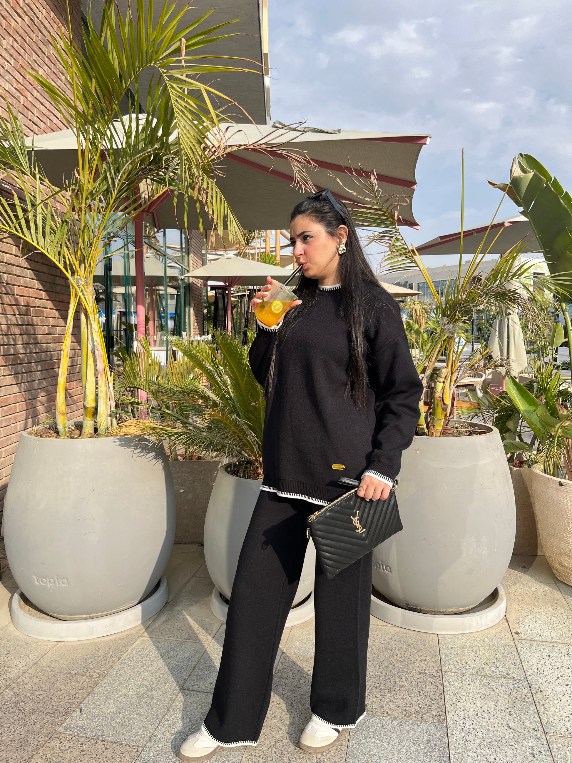 Velora Set captures subtle luxury in a deep black hue outlined with a graceful white trim along the blouse and pants. Perfect for those who love timeless elegance with a modern twist.